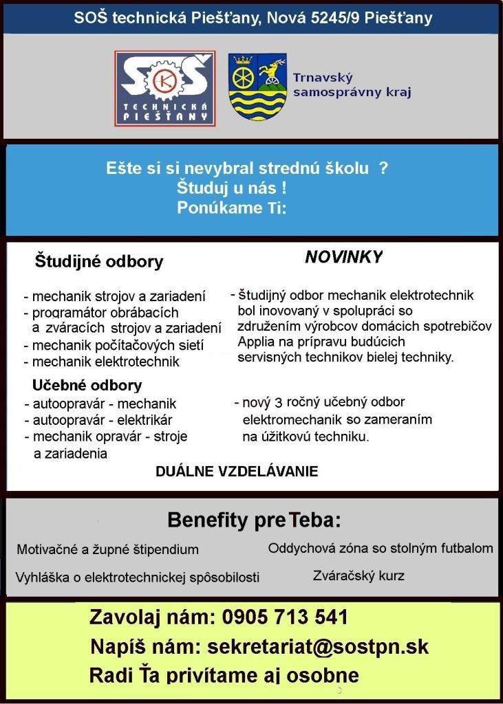 Možnosti štúdia na SOŠT Piešťany v školskom roku 2025/2026