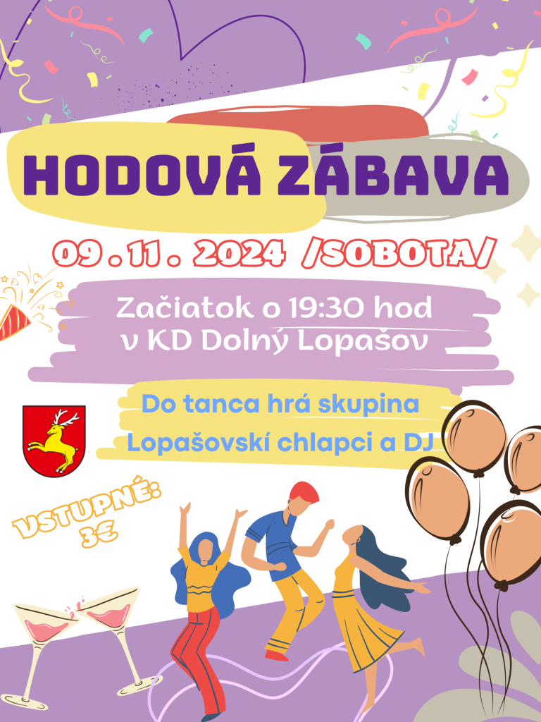 Pozývame Vás na Hodovú zábavu, ktorá sa bude konať v sobotu 09.11.2024 so začiatkom o 19:30 hod. v Kultúrnom dome v Dolnom Lopašove.