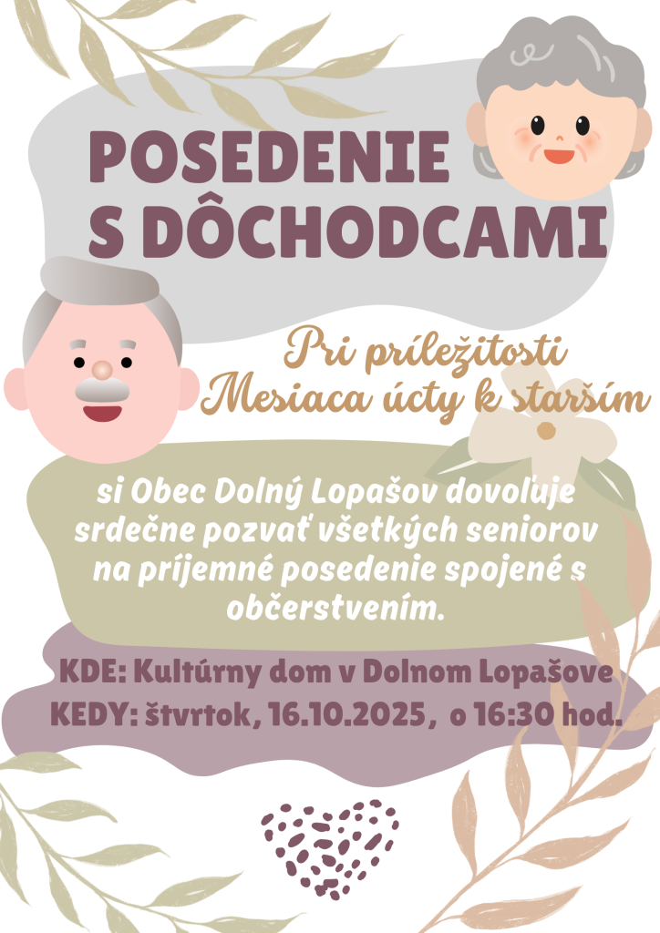 Srdečne pozývame všetkých seniorov na príjemné posedenie spojené s občerstvením, ktoré sa bude konať vo štvrtok 16.10.2025 so začiatkom o 16:30 hod. v Kultúrnom dome v Dolnom Lopašove.