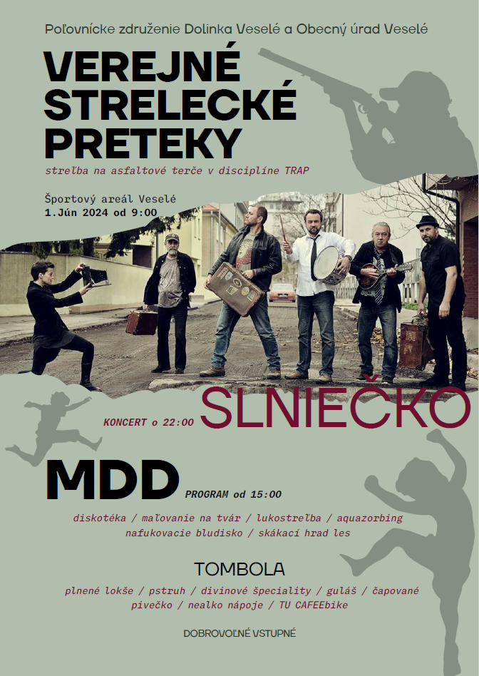 Organizátori pozývajú všetkých občanov na Verejné strelecké preteky Veselé, ktoré sa uskutočnia v sobotu 1.6.2024 od 9:00 v športovom areáli Veselé.